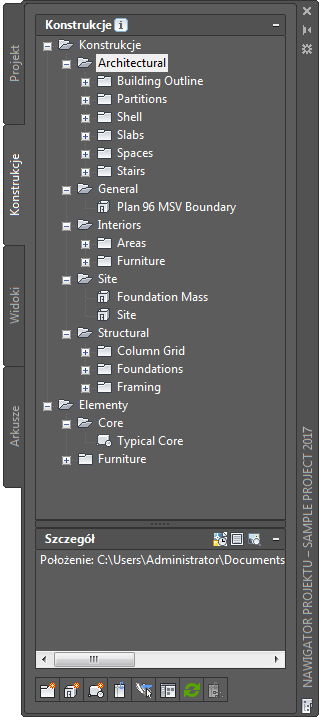 Aby ułatwić sobie organizację projektu budynku, części projektu budynku — konstrukcje, widoki i arkusze — można podzielić na kategorie. Można użyć takich kategorii, jak ściany zewnętrzne, rdzeń i ścianki działowe. Kategoryzacja konstrukcji umożliwia ich filtrowanie podczas generowania widoków.