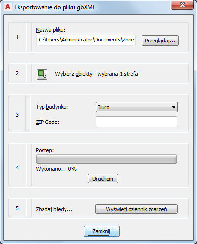 - W oknie dialogowym Eksportuj do gbXML określ ustawienia eksportowania: