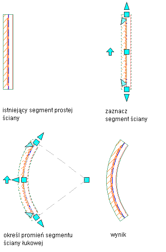 Procedura ta służy do zmiany odcinka prostego na krzywy lub krzywego na prosty. Podczas zmiany ściany prostej na łukową program dodaje uchwyt drugiego punktu krzywej w środku symetrii segmentu ściany. Za pomocą tego uchwytu można następnie zmienić kształt łuku.