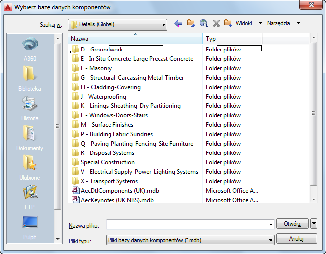 Procedura ta służy do dodania bazy danych do listy aktywnych baz danych komponentów detali, z których komponenty można wybierać do wstawienia, kopiować na inną paletę narzędzi lub używać do zmodyfikowania istniejącego narzędzia.