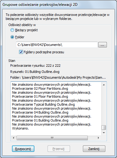 Uwaga: Podczas pracy z dużym projektem budynku aktualizacja wszystkich przekrojów i elewacji może być procesem zajmującym czas. W takim przypadku można rozważyć aktualizację tylko wybranych podfolderów projektu, zwiększając w ten sposób wydajność systemu.