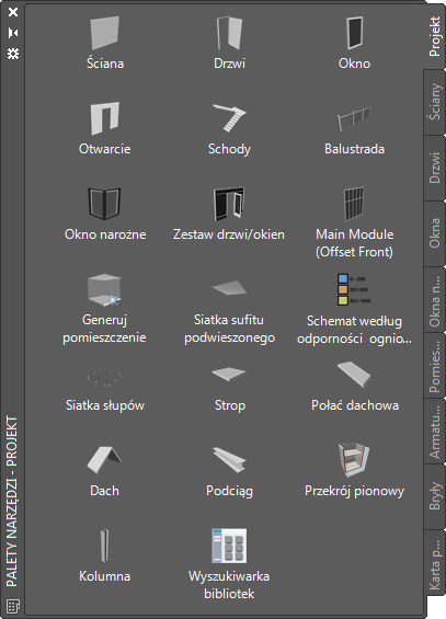 | Narzędzia obiektów | Narzędzie obiektu wstawia obiekt projektu — taki jak ścianę lub zespół okna — do rysunku. Narzędzie obiektu ma przypisany konkretny styl i właściwości: na przykład narzędzie ściany może nazywać się Cegła-4 Cegła-4. |