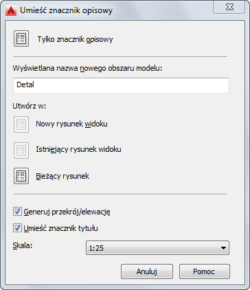 | umieścić znacznik opisowy szczegółu | wstaw narzędzie w sposób opisany w części Aby utworzyć szczegół w bieżącym rysunku widoku. |
