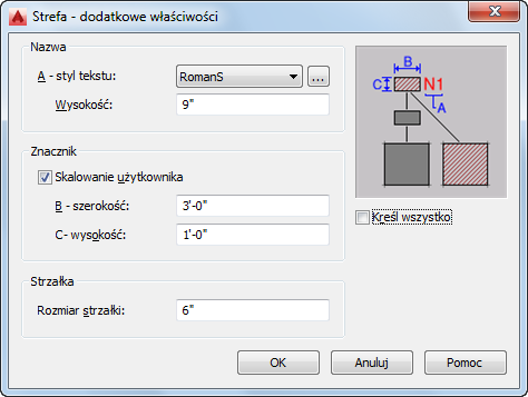 Ta procedura umożliwia określenie stylu tekstu, rozmiaru znacznika strefy i strzałki linii połączenia dla wybranej strefy. Można również określić, czy kreskowanie strefy jest używane tylko w przypadku pomieszczeń dołączonych bezpośrednio, czy również w przypadku pomieszczeń dołączonych poprzez podstrefy.