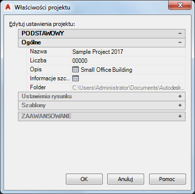 Ta procedura umożliwia zdefiniowanie lub zmianę podstawowych właściwości projektu. Podstawowe właściwości są podzielone na 3 kategorie: