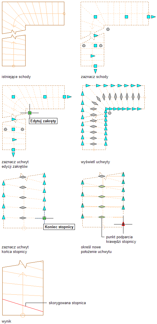 Użyj tej procedury w celu przesunięcia końca poszczególnych stopnic w schodach, którym przypisano styl stopnia zabiegowego Ręczny — Stopnica lub Ręczny — Stopnica Zrównoważony Każda krawędź stopnicy lub powierzchnia podstopnicy obraca się wokół punktu ustalonego na podstawie przecięcia krawędzi stopnicy z linią konstrukcyjną schodów. Przeciągnij uchwyt Krawędź stopnicy do nowego położenia, aby ustalić nowy kąt każdej krawędzi stopnicy.