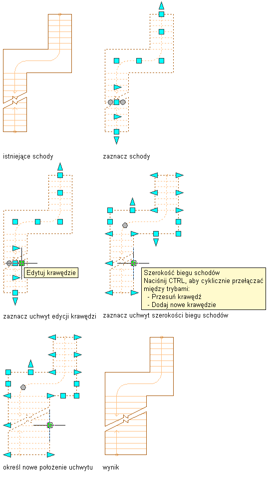 Cała krawędź biegu przemieści się do wybranego miejsca. Zmieni się także szerokość początku schodów, dopasowując się do nowej szerokości biegu.
