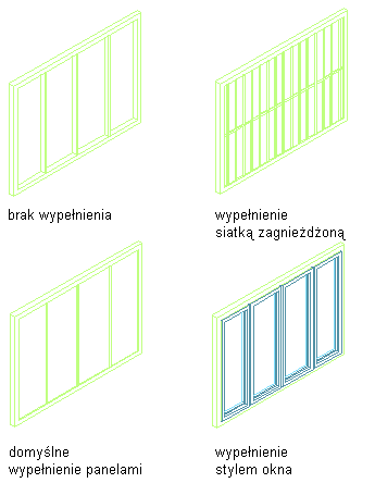 Wypełnienie decyduje o zawartości komórki zestawu drzwi/okien. Komórka zestawu drzwi/okien może zawierać domyślny panel prosty, ale również zagnieżdżoną siatkę, wielokąt AEC, jednostkę ściany kurtynowej, drzwi lub okno. Aby określone style obiektów mogły być dodawane do definicji wypełnień, muszą istnieć w bieżącym rysunku. Zazwyczaj panele reprezentują oszklenie lub inne proste rodzaje wykończenia, na przykład płytami piaskowca lub betonowymi.