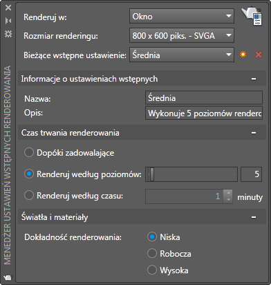 Uwaga: Zmiana ustawień standardowych ustawień wstępnych renderowania powoduje utworzenie nowych niestandardowych ustawień wstępnych renderowania.