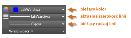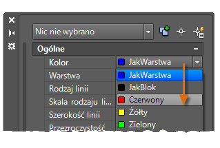 Paleta Właściwości zawiera listę wszystkich istotnych ustawień właściwości. Aby zmienić bieżące ustawienia, można kliknąć dowolne z dostępnych pól. Jeśli w poniższym przykładzie żadne obiekty nie są zaznaczone, bieżący kolor zostanie zmieniony z JakWarstwa na czerwony. Wszystkim nowo utworzonym obiektom będzie przypisywana właściwość koloru Czerwony.