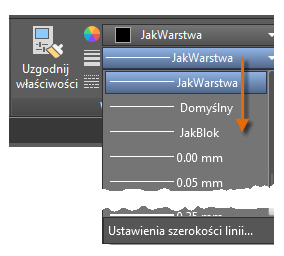 Właściwość Szerokość linii umożliwia wyświetlanie różnych grubości wybranych obiektów. Grubość linii pozostaje stała niezależnie od skali widoku. Szerokości linii są w układzie zawsze wyświetlane i drukowane w jednostkach rzeczywistych.