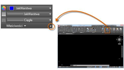 Paleta Właściwości jest podstawowym narzędziem. Można ją otworzyć za pomocą polecenia WŁAŚCIWOŚCI (wprowadź PR w oknie poleceń), naciśnięcia klawiszy CTRL + 1 lub kliknięcia niewielkiej strzałki w panelu Właściwości na karcie Narzędzia główne — w zależności od preferencji użytkownika.