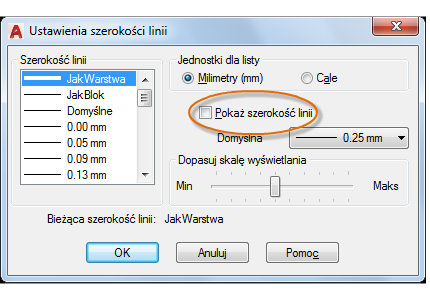 Szerokości linii są zawsze drukowane w prawidłowej skali bez względu na ustawienie wyświetlania.