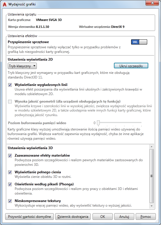 - Umożliwia użycie przyspieszenia sprzętowego i sterowanie wszystkimi ustawieniami efektów dostępnymi dla bieżącego sterownika. Gdy jest wyłączone, jedynie opcja wyświetlania linii gładkich jest aktywna, a oprogramowanie przechodzi w tryb domyślny.