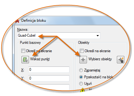 Zamiast tworzenia nowego pliku rysunku, który ma zostać wstawiony jako blok, można utworzyć definicję bloku bezpośrednio w bieżącym rysunku. Tej metody należy użyć, jeśli nie planuje się wstawiania bloku do innego rysunku. W takim przypadku należy użyć polecenia BLOK, aby utworzyć definicję bloku.