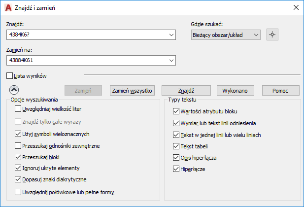 Jeśli na przykład chcesz zmienić podpis wszystkich podobnych części na rysunku na 4384K61, wprowadź 4384K6? w polu Znajdź i 4384K61 w polu Zamień na.