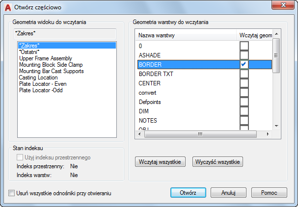 Można wybrać i wczytać geometrię z widoku lub wybranego obszaru lub z warstw. Nie można usunąć żadnych informacji aktualnie wczytanych do rysunku. Jeżeli rysunek zawiera dołączone odnośniki niewczytane podczas częściowego otwarcia rysunku, można ponownie wczytać odnośniki, korzystając z palety Odnośniki. Zobacz opis polecenia ODNOŚNIK.