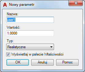 Określa typ nowego parametru. Typy parametrów, które można wybrać: rzeczywisty, odległość, pole, objętość, kąt lub ciąg.