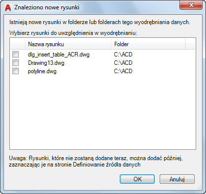Wyświetla listę nowych rysunków dodanych do folderu wybranego do wyodrębniania danych po wykonaniu wyodrębniania.