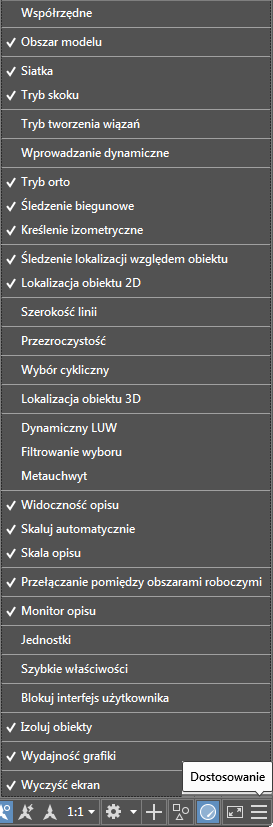 Uwaga: Domyślnie wyświetlanie współrzędnych nie jest wyświetlane na pasku stanu. Aby wyświetlić współrzędne na pasku stanu, wybierz opcję Współrzędne z przycisku Adaptacja na pasku stanu.