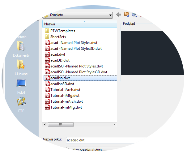 Aby zmodyfikować istniejący plik szablonu rysunku, kliknij przycisk Otwórz, określ typ pliku Szablon rysunku (*.dwt) w oknie dialogowym Wybierz plik i wybierz plik szablonu.