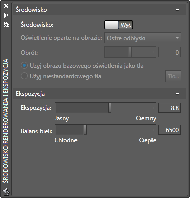 Paleta Środowisko renderowania i ekspozycja służy do ustawiania oświetlenia globalnego sceny.