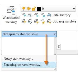 Bieżące ustawienia warstwy można zapisać jako stan warstw, który można później przywrócić lub zaimportować do innych rysunków. Stan warstw jest podobny do zdjęcia istniejących warstw i ustawień warstw zrobionego w czasie tworzenia stanu warstw.