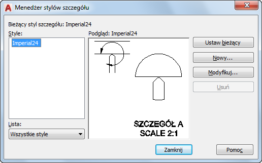 Wyświetla listę stylów szczegółu dostępnych w bieżącym pliku rysunku. Bieżący styl jest wyróżniony.