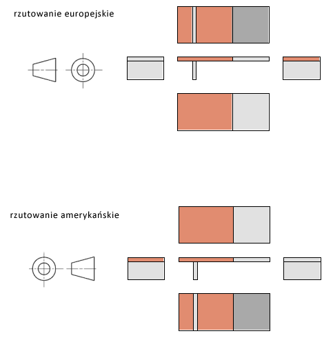 Kąt rzutowania określa, gdzie są umieszczane rzuty prostokątne. Na przykład jeśli aktywnym typem rzutowania jest rzutowanie europejskie, widoki z góry są umieszczane poniżej widoku od przodu. W przypadku rzutowania amerykańskiego widoki z góry są umieszczane nad widokiem od przodu.