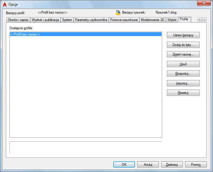 Wyświetla okno dialogowe Dodaj profil umożliwiające zapisanie wybranego profilu pod inną nazwą.