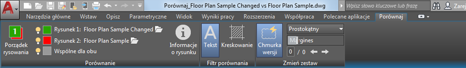 Po wybraniu dwóch plików rysunków do porównania i kliknięciu przycisku Porównaj na wstążce zostanie wyświetlona karta kontekstowa Porównaj.