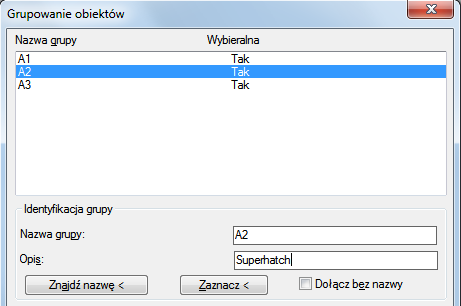 3) Wybierz grupę. Zwróć uwagę, że w polu opisu grup utworzonych poleceniem SUPERHATCH wyświetlany jest napis „superhatch” (superkreskowanie).
