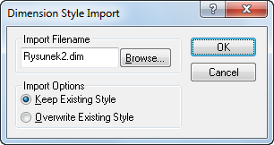 | Import Options | Obejmują opcję Keep the Existing Style zachowującą styl wymiarowania w bieżącym rysunku i opcję Overwrite Existing Style nadpisującą style w bieżącym rysunku. Opcja Keep the Existing Style ignoruje podobnie nazwany importowany styl; opcja Overwrite Existing Style używa podobnie nazwanego importowanego stylu. |
