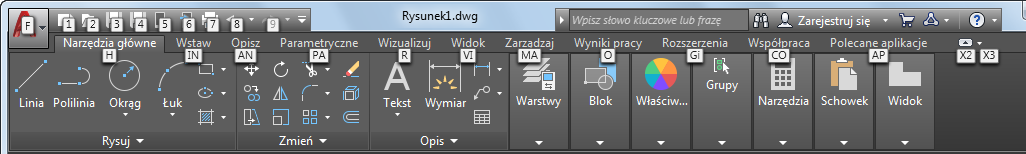 Zamiast urządzenia wskazującego można użyć klawiszy, aby dokonać wyboru z menu, paska narzędzi szybkiego dostępu i wstążki. Aby dowiedzieć się, które klawisze są dostępne w bieżącym obszarze roboczym, naciśnij klawisz Alt.