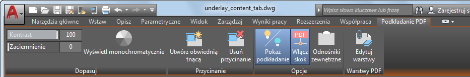 Po wybraniu podkładania PDF na wstążce zostanie wyświetlona karta kontekstowa PDF.