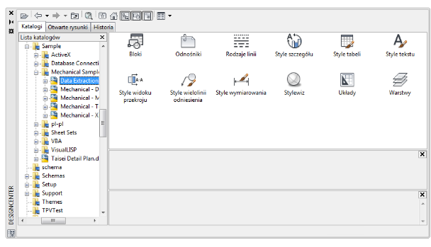Widok drzewa po lewej stronie umożliwia przeglądanie źródeł zawartości i wyświetlanie jej w obszarze zasobów z prawej strony. Z obszaru zasobów można dodawać elementy do rysunku lub palety narzędzi. Dla wybranych rysunków, bloków, wzorów kreskowania lub odnośników zewnętrznych jest wyświetlany podgląd lub opis.