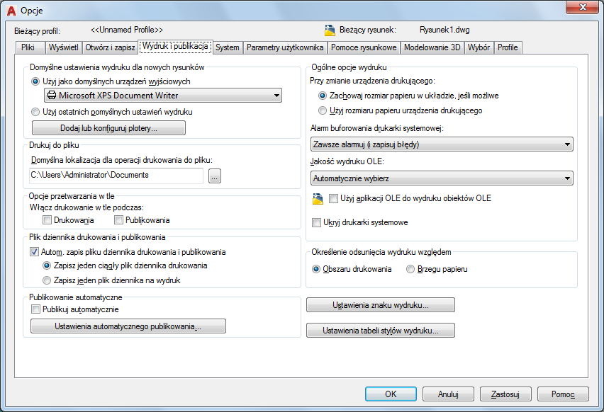 Określa, czy rysunki są publikowane automatycznie w plikach DWF, DWFx lub PDF. Można także określać opcje automatycznego publikowania.