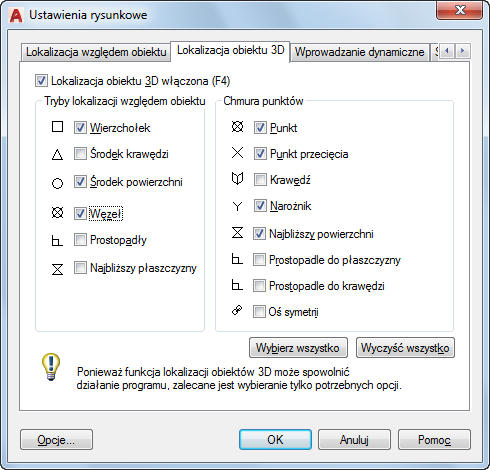 Umożliwia włączenie i wyłączenie lokalizacji obiektów 3D. Indywidualne tryby lokalizacji obiektów 3D wybrane w obszarze Tryby lokalizacji obiektów 3D są aktywne, gdy lokalizacja obiektów jest włączona. (3DOSMODE — zmienna systemowa)