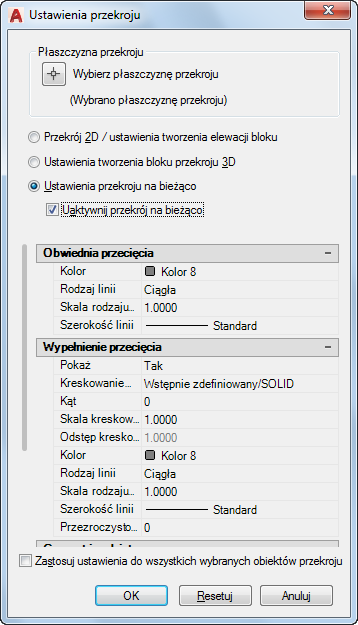 Gdy ta opcja jest włączona, wszystkie ustawienia są stosowane do wszystkich obiektów przekroju w rysunku. Gdy jest wyłączona, ustawienia są stosowane tylko do bieżącego obiektu przekroju.