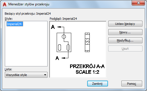 Wyświetla listę stylów przekroju dostępnych w bieżącym pliku rysunku. Bieżący styl jest wyróżniony.