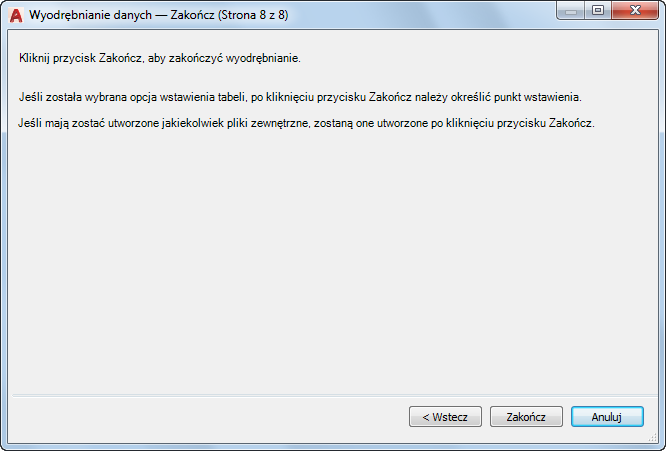 Tworzy tabelę wypełnianą wyodrębnionymi danymi. Po kliknięciu przycisku Zakończ na stronie Zakończ wyświetlany jest monit o wstawienie tabeli do bieżącego rysunku.