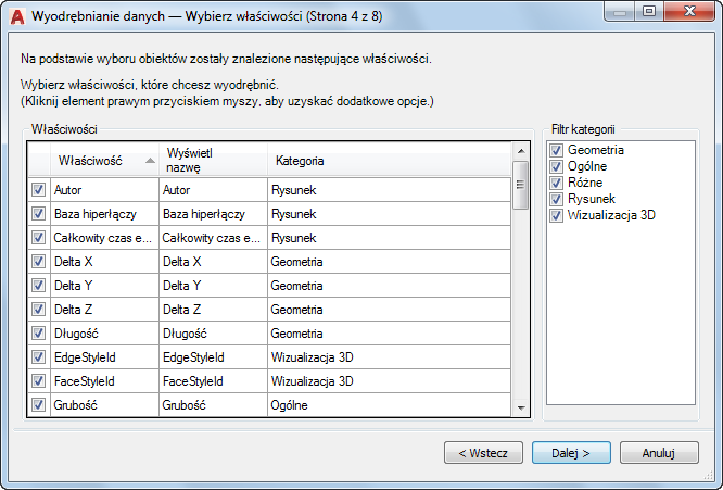 Te informacje są używane do utworzenia tabeli wyodrębniania danych w bieżącym rysunku lub zapisywane w zewnętrznym pliku.
