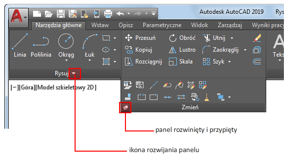 Panel wstążki można wyciągnąć na obszar rysunku lub dodatkowy monitor. Panel ruchomy pozostanie otwarty, dopóki nie nastąpi powrót do wstążki, nawet w przypadku przełączenia karty wstążki.