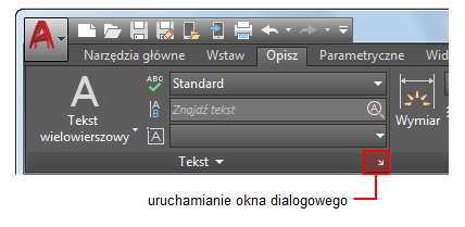 W niektórych panelach wstążki jest wyświetlane okno dialogowe powiązane z danym panelem. Aby wyświetlić powiązane okno dialogowe, kliknij element uruchamiający okno dialogowe oznaczony ikoną strzałki,