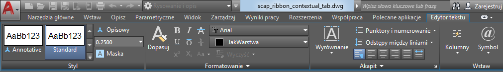 Po wybraniu określonego typu obiektu lub rozpoczęciu niektórych poleceń zostanie wyświetlona kontekstowa karta wstążki zamiast paska narzędzi bądź okna dialogowego. Karta kontekstowa jest zamykana po zakończeniu polecenia.