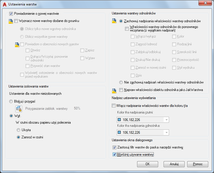 Kontroluje kiedy wyświetlane są powiadomienia o nowych warstwach, zachowanie, gdy niektóre warstwy są izolowane, czy filtry warstw są stosowane do paska narzędzi Warstwy, a także kolor tła nadpisań rzutni w Menedżerze właściwości warstw.