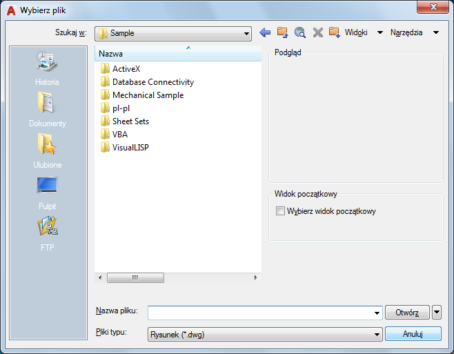 Wyświetla okno dialogowe Otwórz częściowo. Można otworzyć i wczytać fragment rysunku, w tym geometrię dla określonego widoku lub warstwy. Polecenia OTWÓRZCZĘŚĆ można używać tylko w przypadku rysunków w formacie programu AutoCAD 2004 lub nowszych wersji.