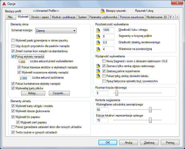 Wyświetla karty Układ i Model na dole obszaru rysunku. Wyczyszczenie tej opcji powoduje, że zamiast kart są wyświetlane przyciski na pasku stanu.