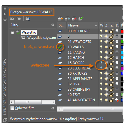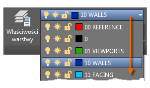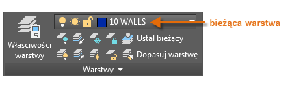 Jak widać na ilustracji, warstwa 10 WALLS jest warstwą bieżącą. Wszystkie nowe obiekty są automatycznie umieszczane na tej warstwie. Na liście warstw zielone pole wyboru obok warstwy 10 ŚCIANY potwierdza, że jest to warstwa bieżąca.