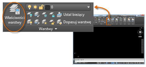 Menedżer właściwości warstw zajmuje dużo miejsca i nie wszystkie opcje są zawsze potrzebne. Aby uzyskać szybki dostęp do najczęściej używanych elementów sterujących warstwami, użyj elementów wstążki. Jeśli żadne obiekty nie są wybrane, w panelu Warstwy na karcie Narzędzia główne wyświetlana jest nazwa bieżącej warstwy, jak pokazano poniżej.